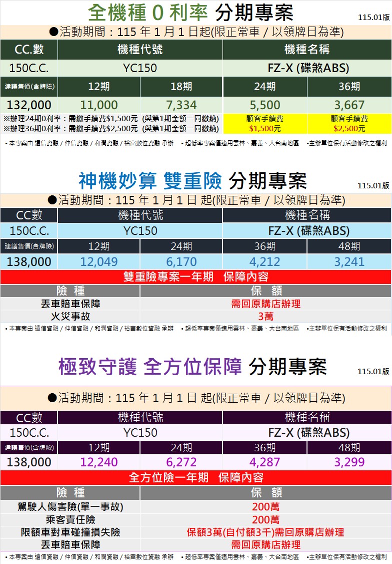 本網站由YAMAHA地方販路架設維護,而非YAMAHA台灣山葉機車官方網站, 主要服務內容為雲林/嘉義/台南地區Yamaha新車購車優惠、活動訊息, 希望能帶給消費者優質的賞車體驗。販促內容以大鴻葉股份有限公司公告為主